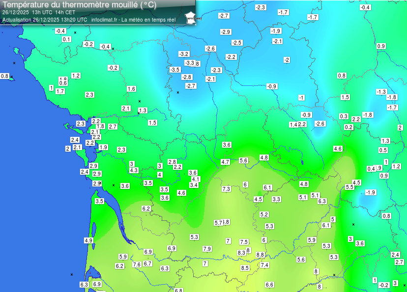 Thermomètre mouillé Températures sur thermomètre mouillé actuelles Centre-Ouest France fournies par infoclimat.fr